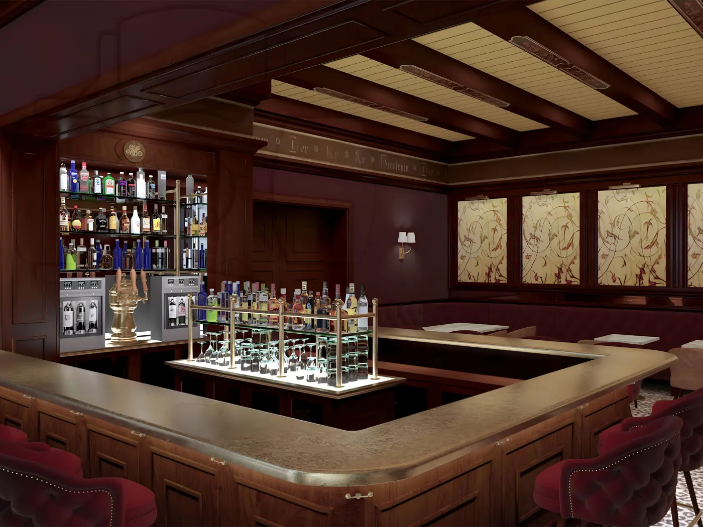 Full-material 3D illustration for a country club bar and lounge interior, rendered following final client material selection.